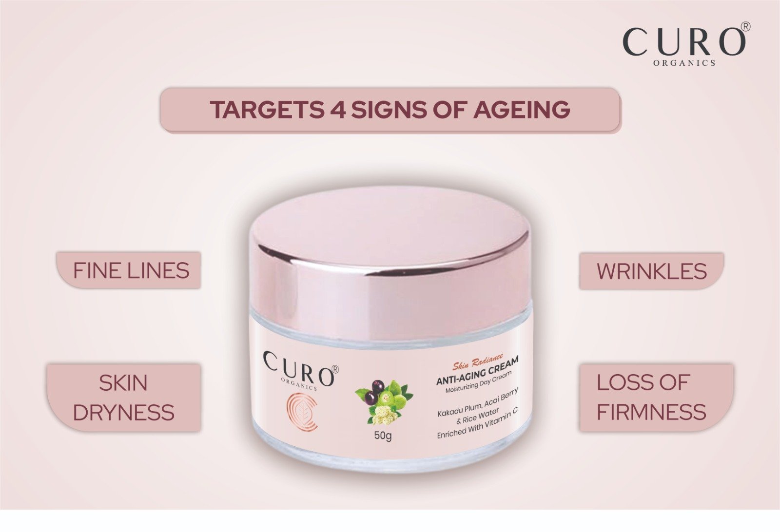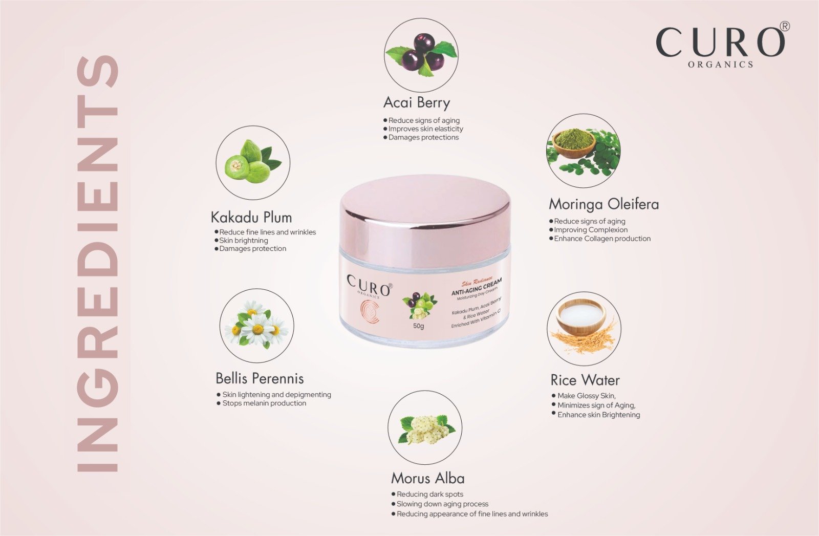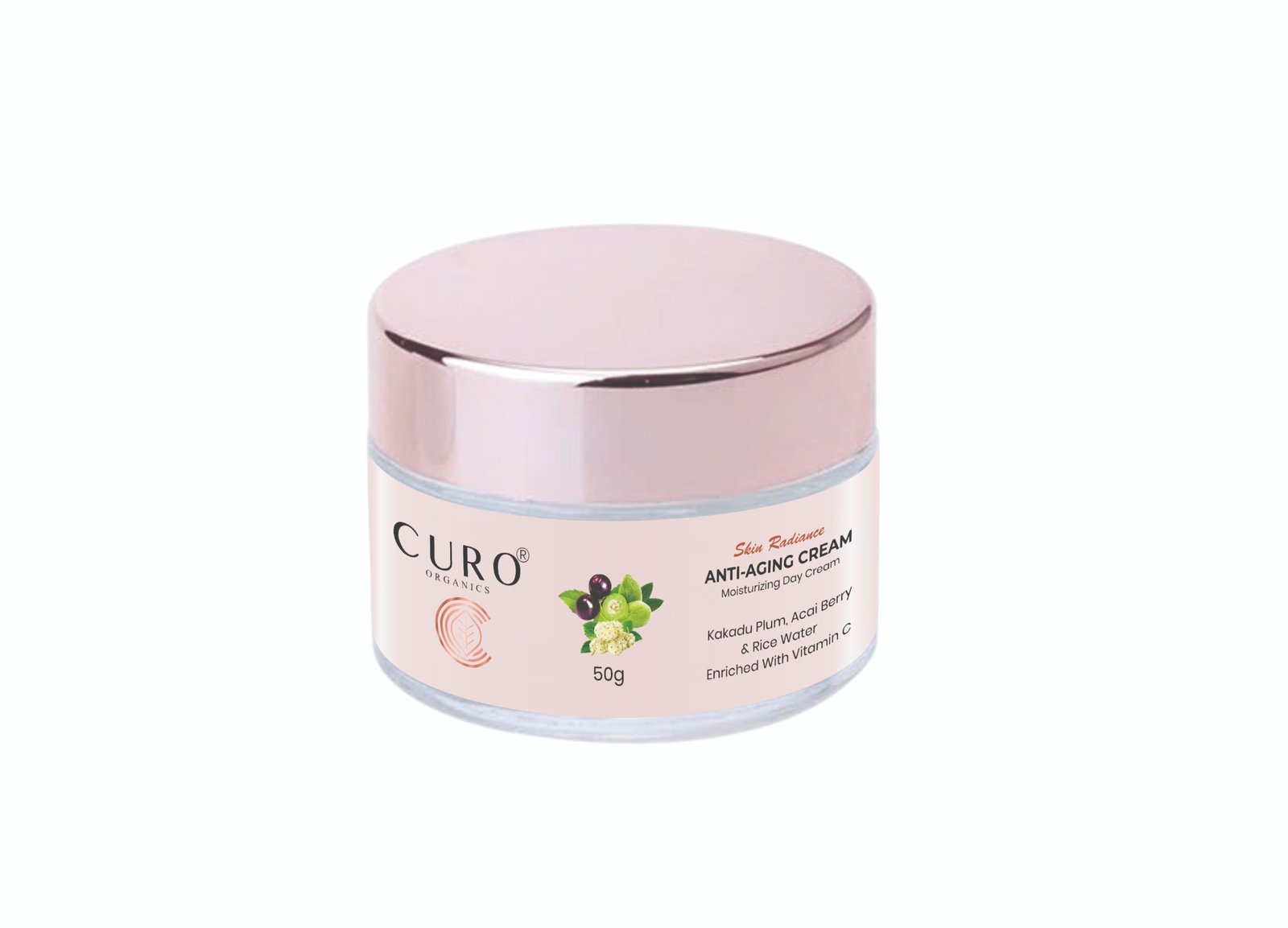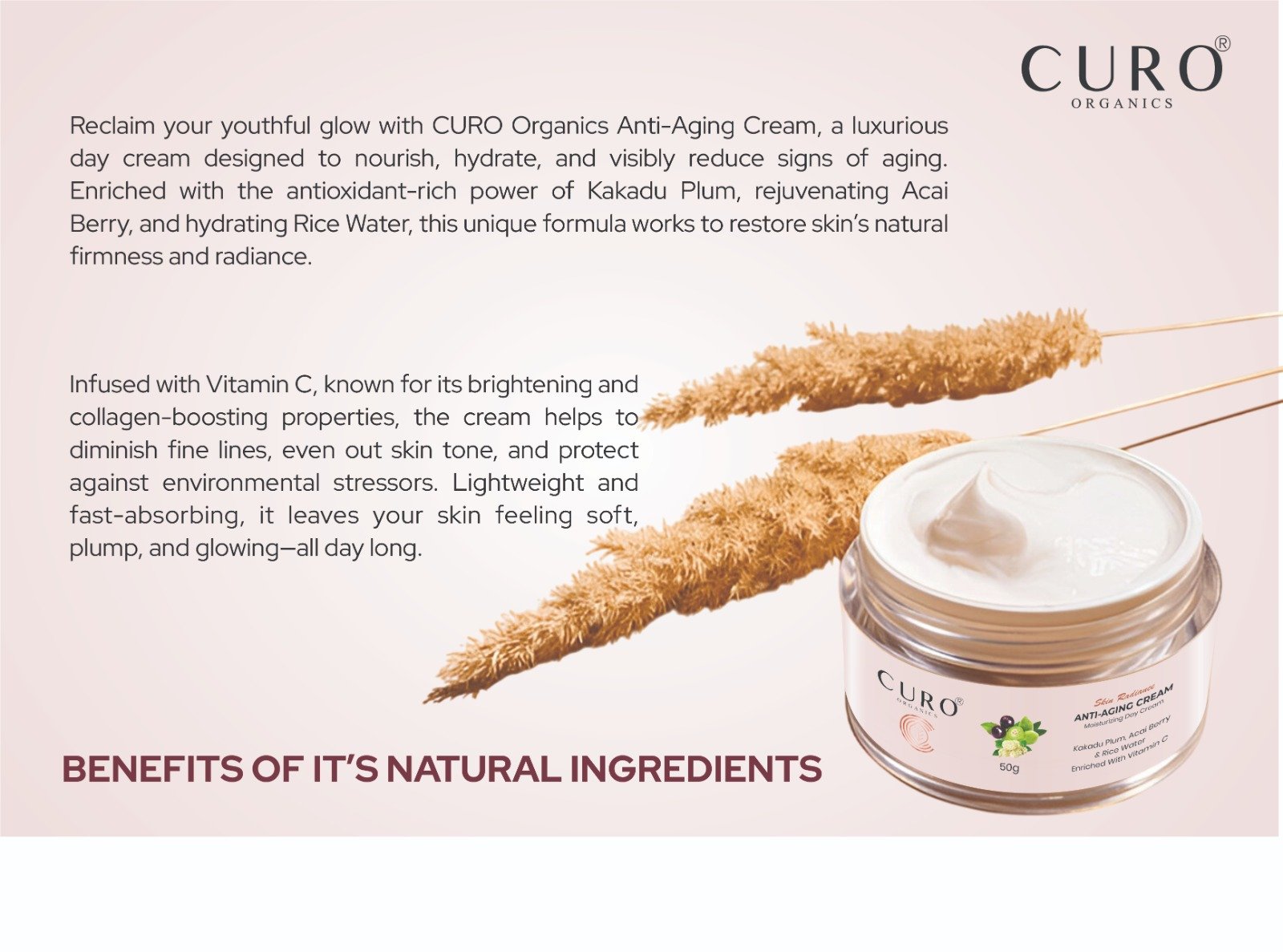 Reclaim your youthful glow with CURO Organics Anti-Aging Cream, a luxurious moisturizer designed to nourish, hydrate, and visibly reduce signs of aging. Enriched with the antioxidant-rich power of Kakadu Plum, rejuvenating Acai Berry, and hydrating Rice Water, this unique formula works to restore skin’s natural firmness and radiance.